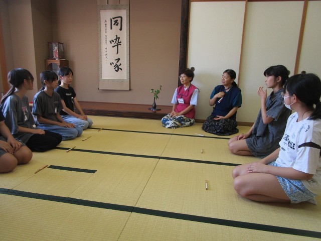 今年度も作法クラブが始まりました。席入りの仕方とお菓子とお茶のいただき方から教えていただきました。