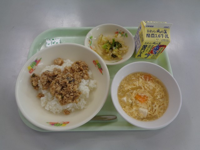 今日は、昨年初登場した、「ガパオライス」でした。ガパオライスは、タイでは国民食と言っていいほど、よく食べられているそうです。今日は、富山県産の「えごまの葉」が入っていました。どんな味だったでしょうか。お子さんに聞いてみてください。今日もおいしくいただきました。