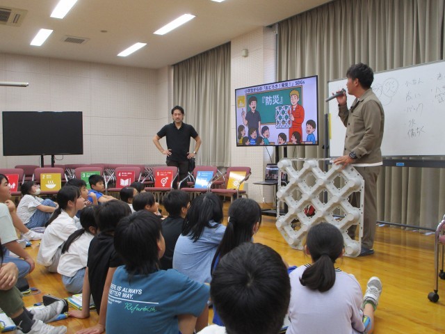 深井宣光さん、小澤辰矢さんをゲストティーチャーとしてお招きし、身近な仕事が防災につながっていることを教えていただきました。