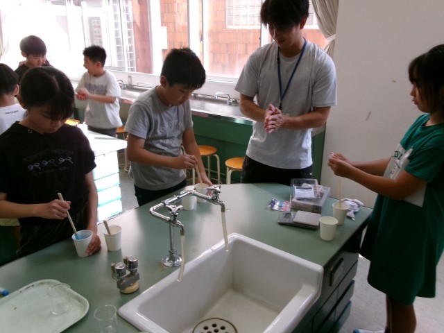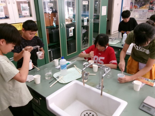 スライムをつくりました。6年生が4年生に材料を量る方法や道具の扱い方を優しく教えたり、5年生が自分にできることを探しながら活動したりしていました。4年生は、初めての作業にも失敗を恐れずにチャレンジしました。他の学年と関わり、楽しんで活動しています。