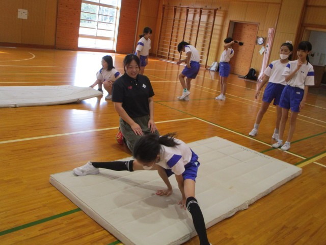 富山市スポーツ協会のスポーツ指導員をお招きし、マット運動の授業を受けました。教えていただいたポイントを意識して取り組みました。
