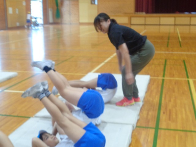 富山市スポーツ協会のスポーツ指導員の方をお招きし、後転のポイントを教えていただきました。