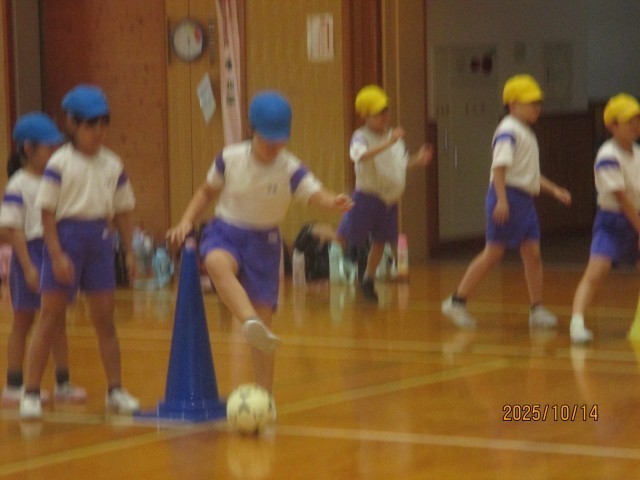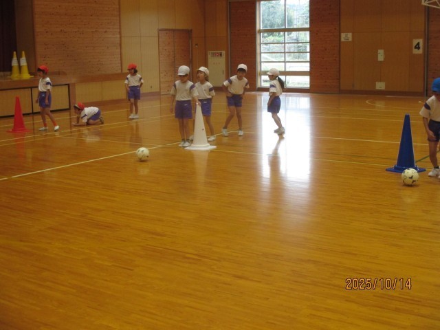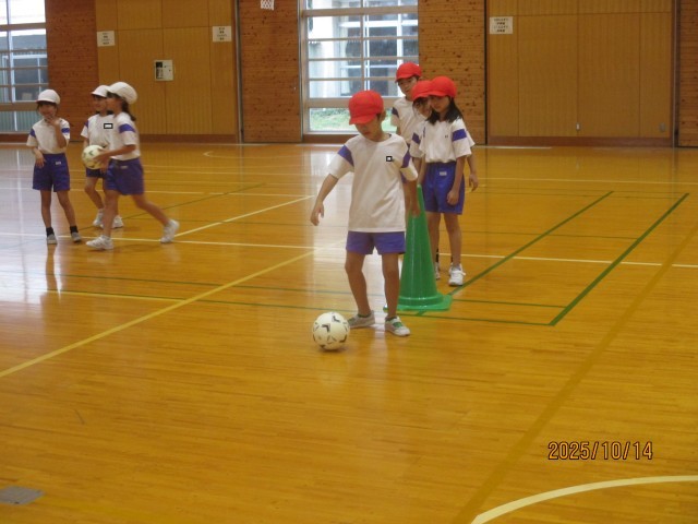 キックベースを行うために、ボールを投げて転がしたり、狙ったコーンにボールを蹴って当てたりする練習をしました。思ったところにボールを蹴ることがなかなか難しく、子供たちは苦戦していましたが、少しずつ上手になっていきました。
