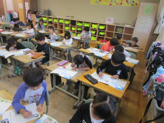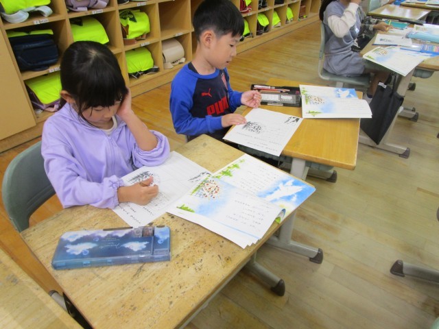 「くじらぐも」の学習が終わりに近付いてきました。今日は、最後の場面の「くじらぐも」と「子供たち」の気持ちを考え、ワークシートにまとめました。「くじらくも」に乗せてくれてありがとうの気持ちや「また、遊ぼうね」という考えが出てきました。