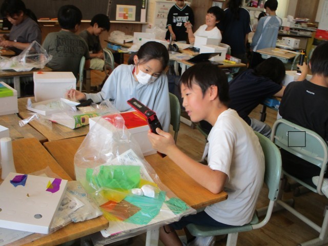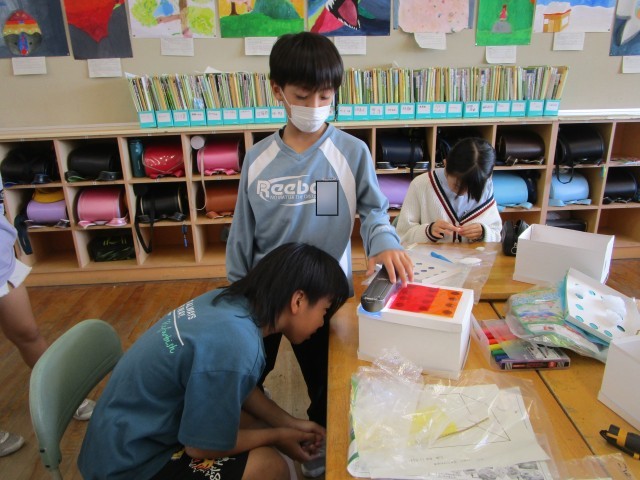 自分で持ってきた材料を生かしたり、友達と相談したりして、楽しみながらつくっています。