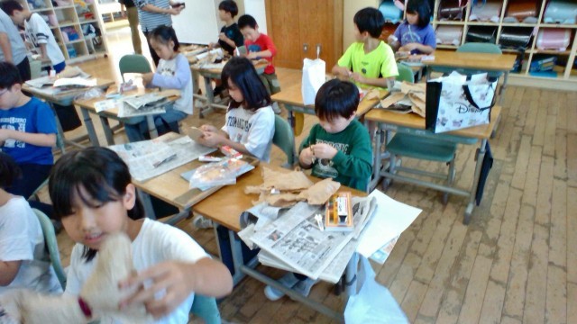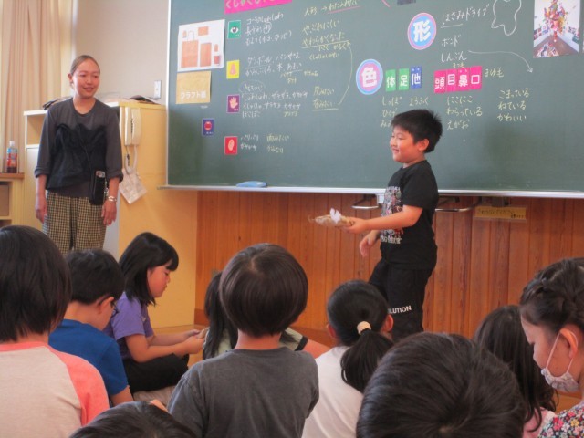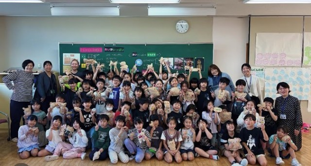 外部の先生を迎えて、クラフト紙を使った学習を行いました。子供たちはクラフト紙に触れたり、匂いを嗅いだりするなど、五感を使って教材に関わり楽しく活動に取り組み、最後は自分だけの特別なお友達(作品)を完成させて、嬉しそうに友達と見せ合いっこしました。