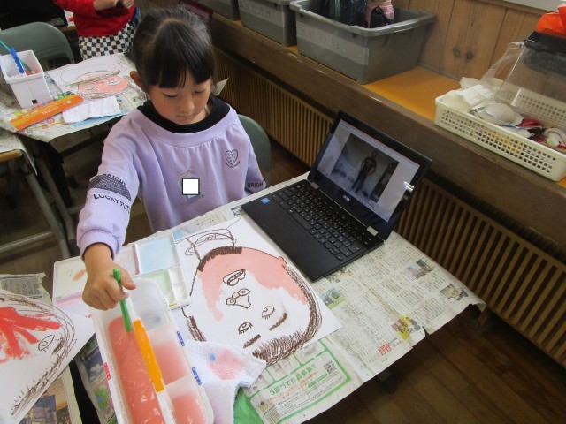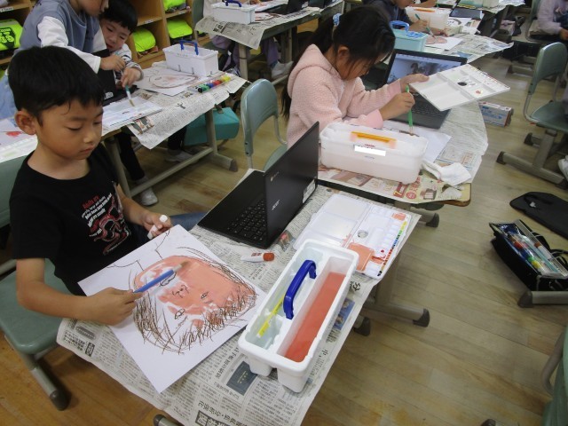 1年生 図工 先生あのね~パパ・ママのことおしえて~ 公開日 2025/10/22 更新日 2025/10/22 1年生 クロームムブックで撮ったパパ・ママの写真を確認しながら、顔に色を塗り始めました。肌色の濃さや色味の違いをよく見て描きました。