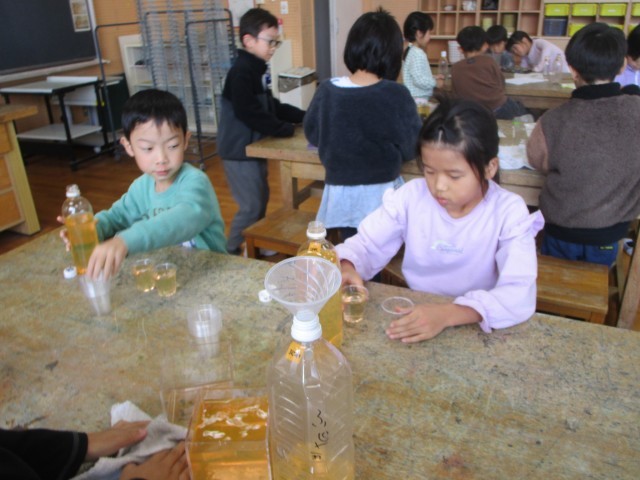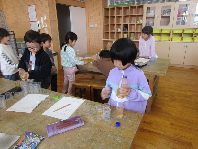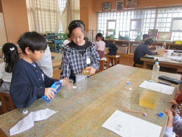 前回調べて多かったペットボトルを使って、ペアになってどちらがどれだけ多いのかを考えました。容器の目盛りやコップが何個分かで比べていました。