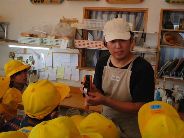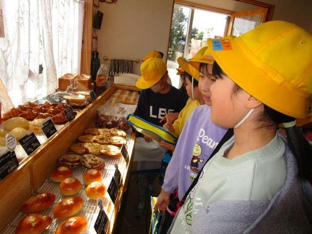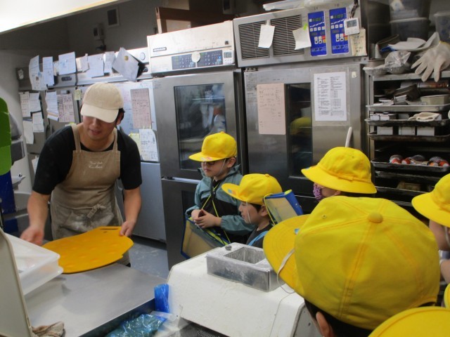 町探検で、パン工房のCoCoマロンに行ってきました。子供たちは事前に考えたインタビューに答えてもらったり、工房の中の機械を見せてもらい説明を聞いたりしました。子供たちはパンの美味しそうな匂いに、今度は家族と買いに来たいと目を輝かせていました。