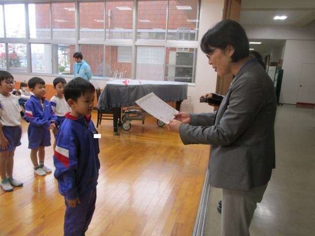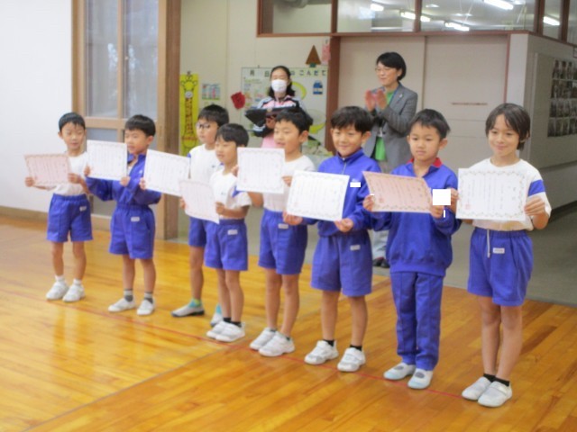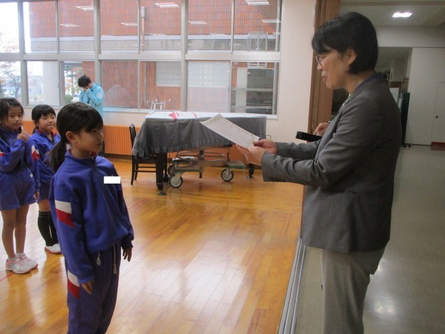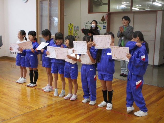 マラソン大会の表彰式が行われました。8位まで入賞した児童は賞状を笑顔で受け取っていました。一年生の子供たちは、どの子もタイムが伸びました。子供たちのがんばりに大きな拍手を送りました。