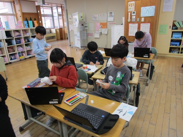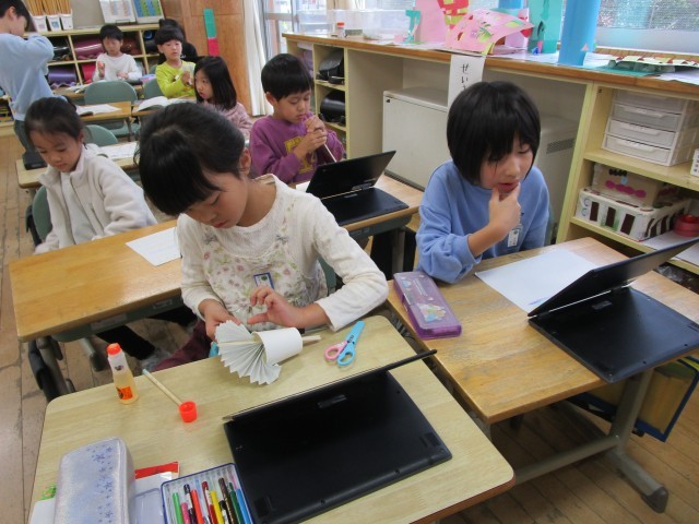 国語科の学習で、説明文をよく読みながら紙コップ花火をつくりました。「1センチメートルと書いてあるけれど、どっち向きに折ればいいの?」「手前がわと書いてあるよ」など、友達と教え合いながら、写真や文章をもとに自分たちでつくりあげることができました。