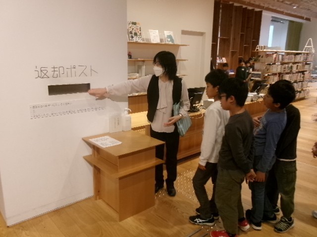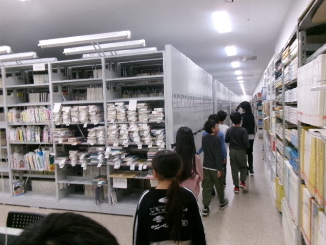普段は見ることのできない書庫の中を見学しました。また、本に貼ってあるシールの意味や、図書館の設備についても教わりました。