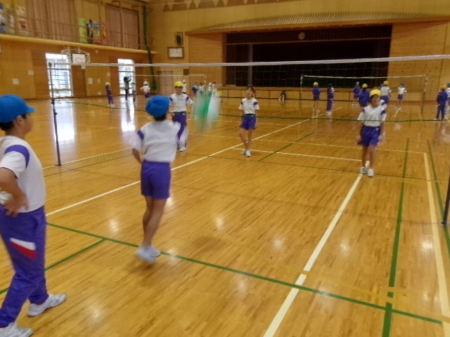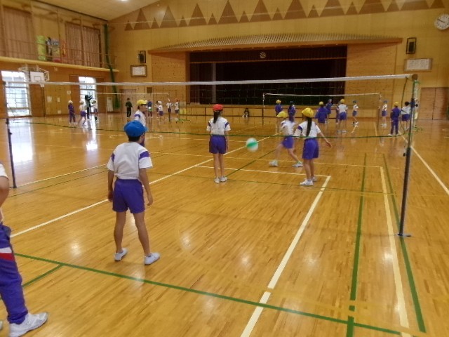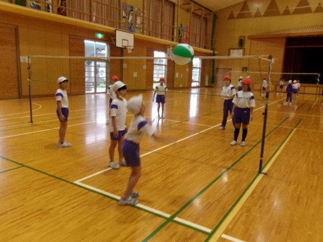 「みんなで協力してボールをつなげよう」の目当てのもと、ビーチボールに取り組んでいます。