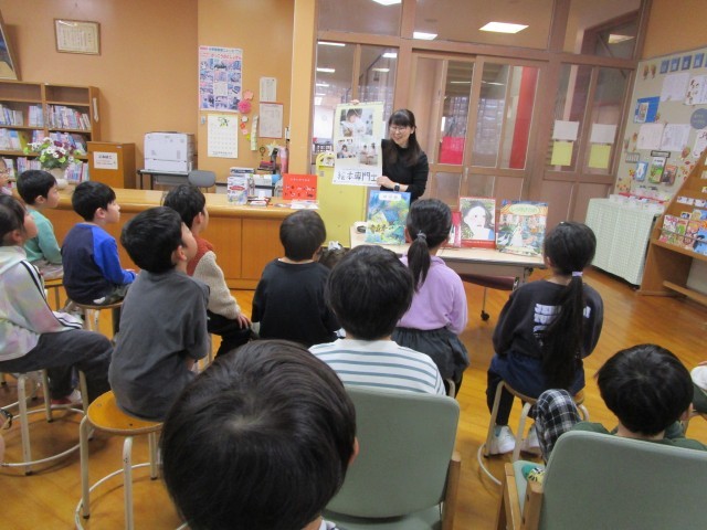1年生は、人形劇「鍋トコトコ」を見ました。お鍋がしゃべることに子供たちが驚いていました。絵本の紹介では、白雪姫のお話が自分の知っているお話と異なる部分があることを知りました。