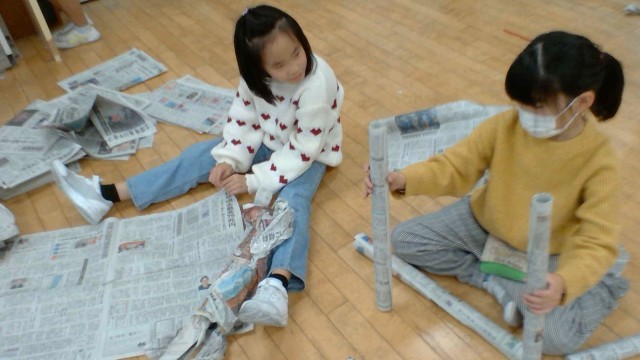 新聞紙をくしゃくしゃにしたり、ぎゅっと丸めたりしたりして、何ができるかを考えました。子供たちは、友達と協力して、いろいろなものをつくって楽しみました。