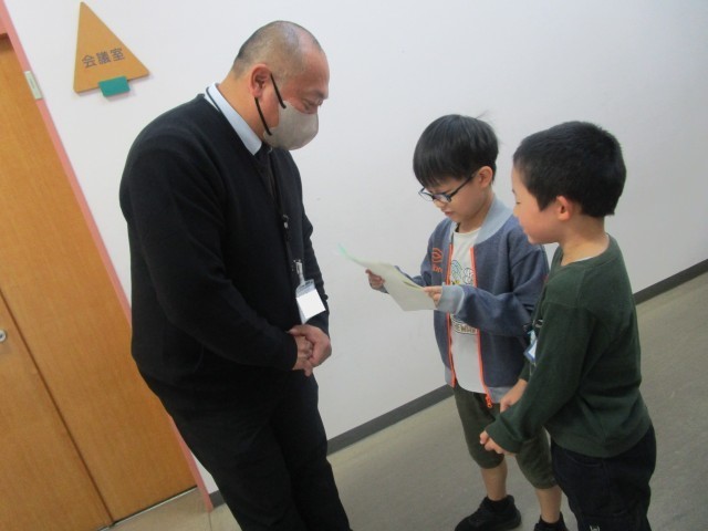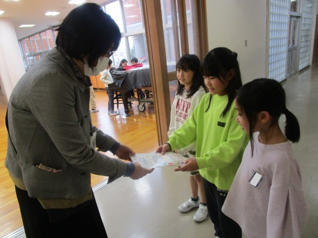 「1年生だけでなく、他の学年や先生も呼びたい」と、ぐんぐんおもちゃランドの招待状を渡しました。緊張しながらも思いを伝えることができました。