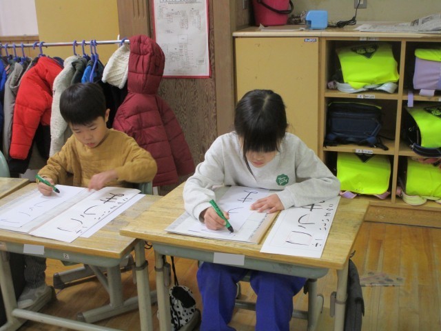 書初め練習の3回目を行いました。「お手本をよく見て、そっくりに書く」をめあてにがんばっています。今日は文字の大きさを意識して書きました。