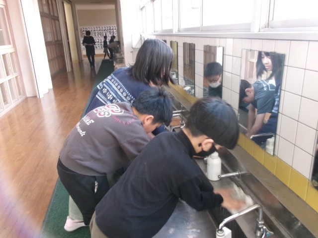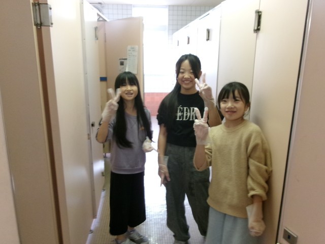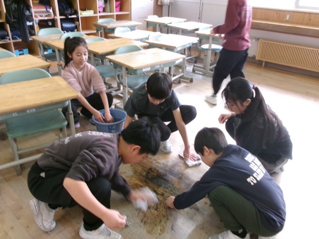 教室の机や床、手洗い場、トイレ等、使った場所をみんなで協力して掃除しました。清掃を終えた子供たちは、すがすがしい表情をしています。