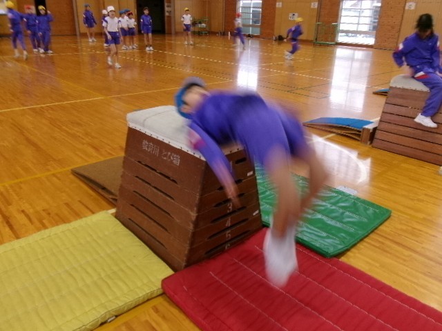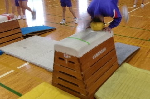 開脚跳びや台上前転、首はね起きの練習をしています。