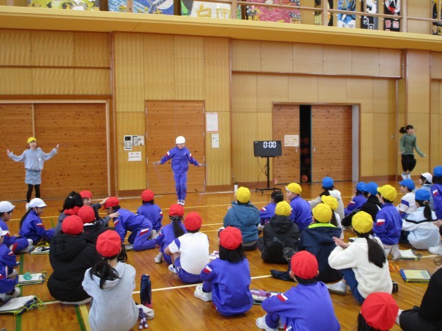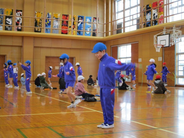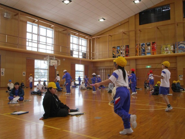 縄跳びの中間記録会を行うにあたり、2年生の計測を5年生が行いました。