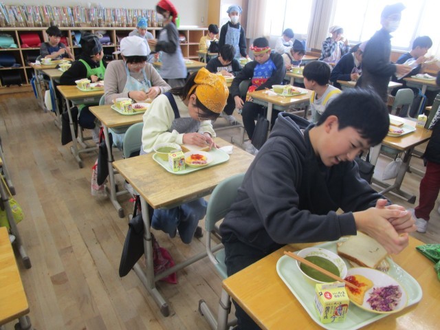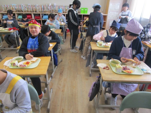 6年生 給食週間 公開日 2026/01/30 更新日 2026/01/30 6年生 今週は給食週間でした。毎日学習にちなんだ献立を楽しんで食べました。写真は「図工」の日にチョコペンで食パンにお絵描きをしている様子です。