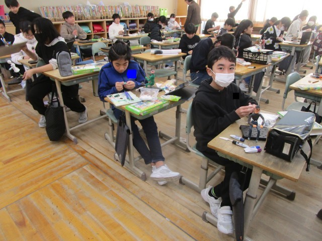 図工の授業では、将来憧れの職業に就いている自分や、趣味を楽しんでいる自分を想像して作品をつくっています。人間の形をした芯材を上手に使い、躍動感を出したり細かい動きを再現したりできるよう集中して取り組んでいます。