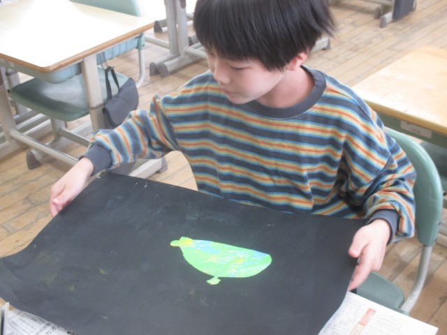 ステンシル版画最後の活動になりました。シールを剥がしたところから、さまざまな形が浮かびあがって来て、子供たちは喜んでいました。