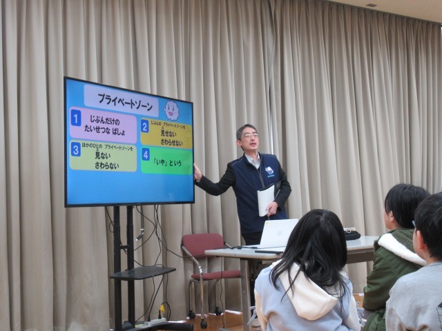 少年サポートセンターの方に来ていただいて、くもくん教室を行いました。子供たちは、プライベートゾーンについての話を真剣に聞いていました。振り返りのカードを配付しました。ご活用いただき、プライベートゾーンについて家庭でお子様と話し合うよい機会となれば幸いです。