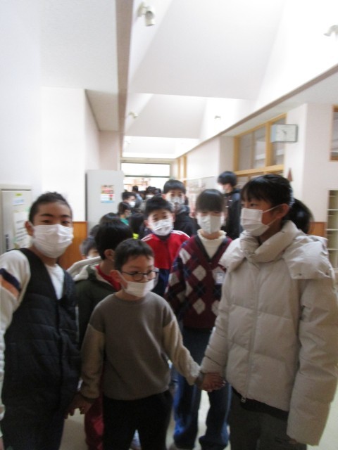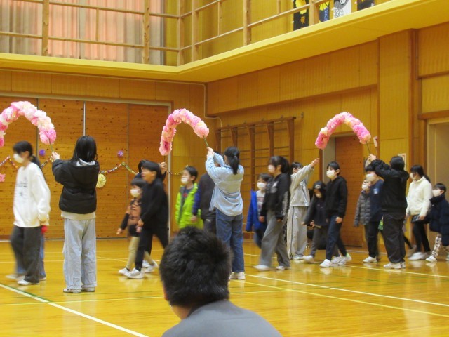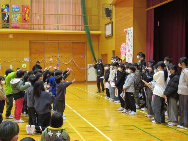 卒業を祝う会が行われました。1年生の役目は、6年生のみなさんと入場することでした。手をつないで入場しました。みんなでつくったプレゼントをファミリー活動のお兄さんお姉さんに渡しました。最後に感謝の思いを込めてエールを送りました。