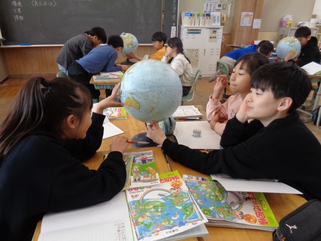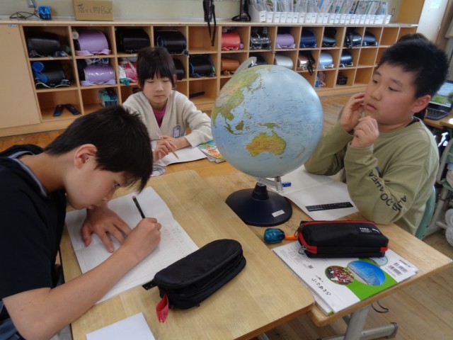 地球儀を見て気付いたことを話し合いました。