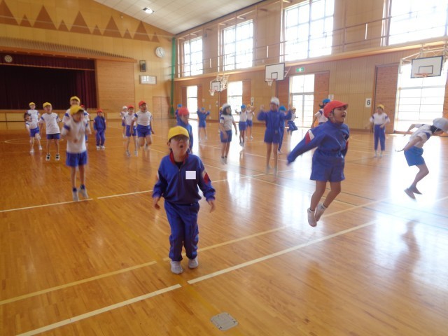 体ほぐしの運動をした後、鬼ごっこをしました。鬼に捕まらないように息を切らしながら逃げたり、鬼になっていろんな子にタッチしたりするなど、全員真剣に体育館中を走り回りました。