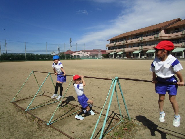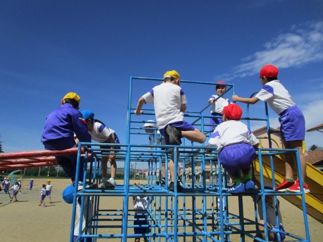 遊具を使って遊びました。鉄棒の新しい技にチャレンジするなど、元気に体を動かしています。