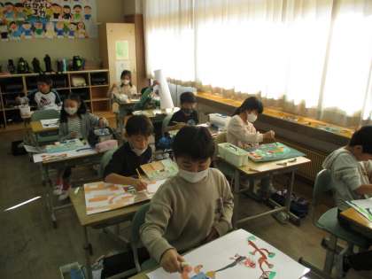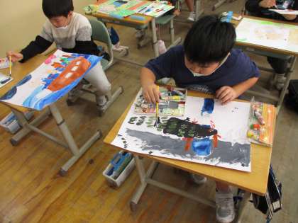 3年生 昔話や民話の世界を絵で表したよ 公開日 2020/11/24 更新日 2020/11/24 3年生 図工では、お気に入りの昔話や民話を絵で表しています。薄く色を伸ばしたり、たくさん点を描くように背景を描くなど、水彩での描き方を生かして、楽しんでいます。