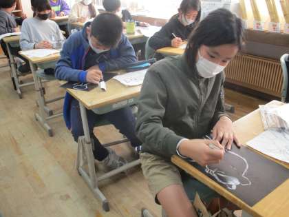 図工で「消して書く」という学習をしています。黒い紙のところに写した下絵を消しゴムで消しながら、絵を表現していきます。