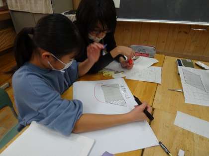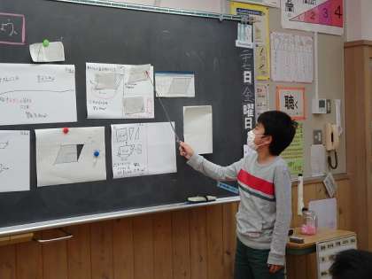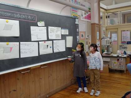 平行四辺形の面積の求め方を考えています。 グループの友達と考えを出し合っていました。