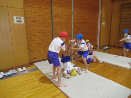 4年生 マット運動「倒立系の技の練習」 公開日 2020/12/01 更新日 2020/12/01 4年生 マット運動の学習を始めて3回目の今日から、技ごとに場所を分けて練習を行いました。倒立をするのは久しぶりということもあり、三点倒立やじゃんけんから感覚を慣らしていきました。