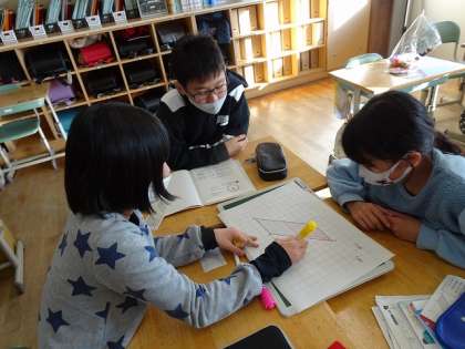 平行四辺形の面積を求める公式が使えるかをみんなで考えていました。