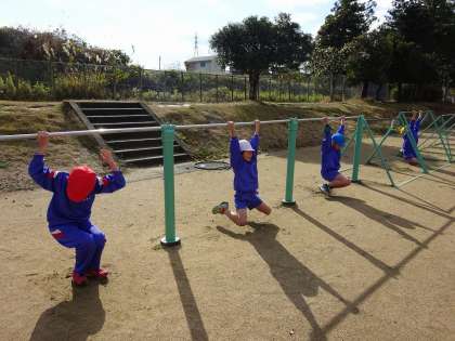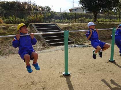 晴れた日には、グラウンドで鉄棒の学習をしています。いくつかの技をつなげて、発表会を行う予定です!
