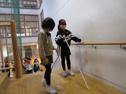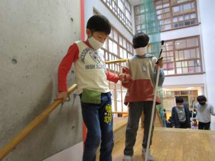 3年生 目の不自由な人の思いを感じ取ろう 公開日 2020/12/07 更新日 2020/12/07 3年生 目の不自由な人が感じる気持ちを知りたいと考え、体験学習を行いました。アイマスクで目が見えない状態で階段を上り下りするのはとても怖く、介助してくれる人や手すりにありがたさを感じました。今回の体験を生かして、総合的な学習の時間で学びを深めていきたいと思います。