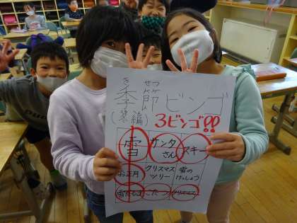 2年生 なかよし(リモート)集会 公開日 2020/12/09 更新日 2020/12/09 2年生 リモートでなかよし集会が行われ、全校で冬ビンゴを楽しみました!3ビンゴを達成し、子どもたちは大喜びでした!