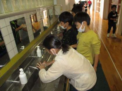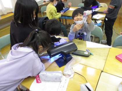 3年生 手洗い学習 公開日 2020/12/10 更新日 2020/12/10 3年生 保健では、手洗いについての学習を行いました。手洗いチェッカーを使うことで、普段の手洗いで残ってしまっていた汚れについて知り、「もっときれいにしたい」と手洗いを工夫したいと考えるようになりました。