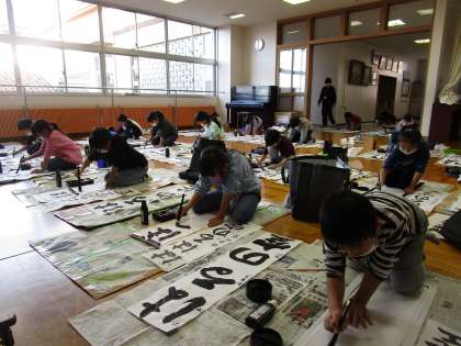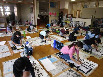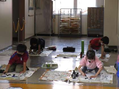 「はるの空」 子供たちは、毛筆での書初にどきどきした様子でしたが、 一字ずつ、丁寧に書きました。