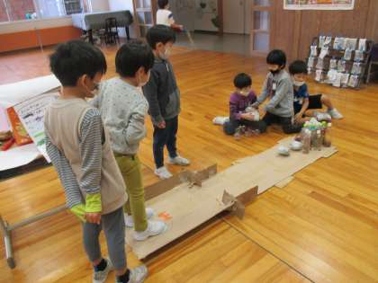 今日は、1年生の秋のおもちゃランドに行ってきました。リズムにのって、どんぐりマラカスを振ったり、ボーリングを楽しんだりしていました。ボーリングでは、10本以上あるピンを全部倒そうと、盛り上がっていました。