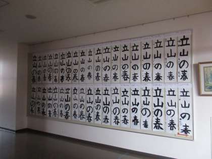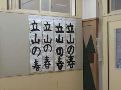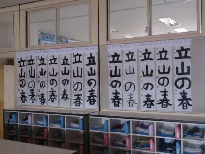 4年生 書初作品「立山の春」 公開日 2020/12/12 更新日 2020/12/12 4年生 教室前廊下等に書初作品を展示しました。 作品を見た子供は、 「3年生の時より、みんなうまくなっているな」 「あの時の字、『思いやり』は、ひらがなが多くて大変だった」 と感想を話していました。来週も、練習を行います。 保護者の皆様も、15日(火)からの個別懇談会の折、子供たちの作品をご覧ください。