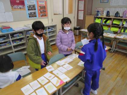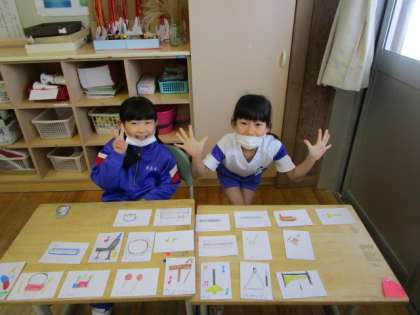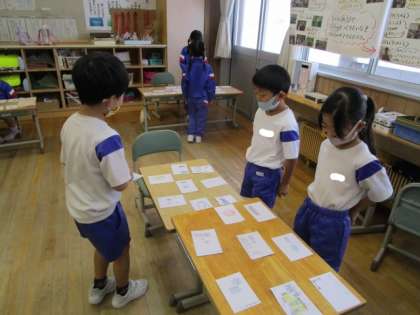 作ったカードを並べて、お店屋さんを開きました。「さかな屋さん、サバをください」などと、一つ一つのものの名前を意識してお店屋さんを楽しみました。
