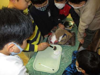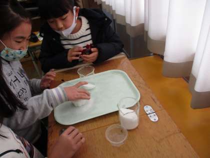 理科では、同じ体積の物はみんな同じ重さになるか調べました。塩と砂糖を慎重にカップに整え、同じ体積にして重さを計りました。見た目が同じでも重さが違うことに子供たちは驚いていました。