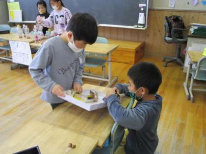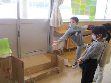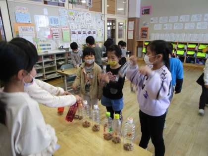 最後にもう一度、クラスで「あきのおもちゃ1まつランド」を楽しみました。お試しの時より、どのおもちゃもパワーアップしていて、思い切り楽しんでいました。自分で作ったおもちゃで楽しく遊ぶ友達を見て、さらに笑顔いっぱいになっていた子供たちです。