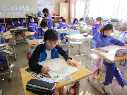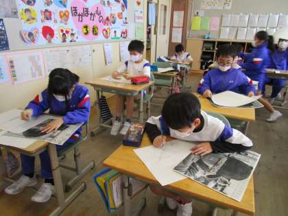 3年生 自分の顔をよく見て描こう 公開日 2021/01/20 更新日 2021/01/20 3年生 図工では、版画の下書きを行っています。鏡や写真に撮った自分の顔のつくりをよく見て、丁寧に描いています。