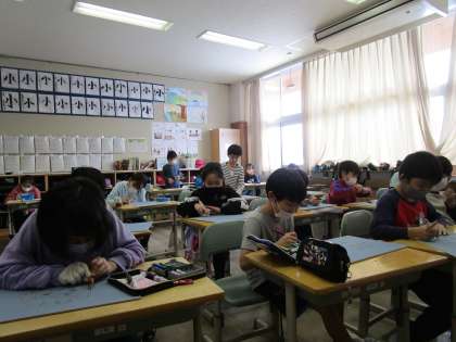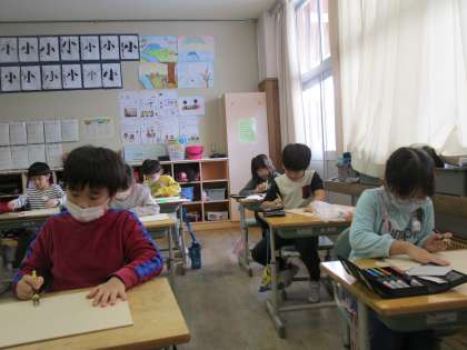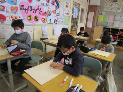 3年生 初めての彫刻刀1 公開日 2021/01/26 更新日 2021/01/26 3年生 図工では、木版画に挑戦しています。 今日は、初めて彫刻刀を使いました。 彫る向きや手の位置に気を付けて、彫り進めています。