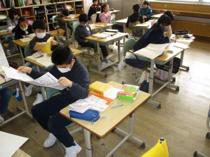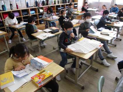 国語では、5・7・5のリズムに乗せて、同じ漢字の音と訓それぞれの読み方を入れた音訓かるたを作りました。国語辞典や教科書を使って今までの漢字を振り返り、楽しいかるたを考えました。